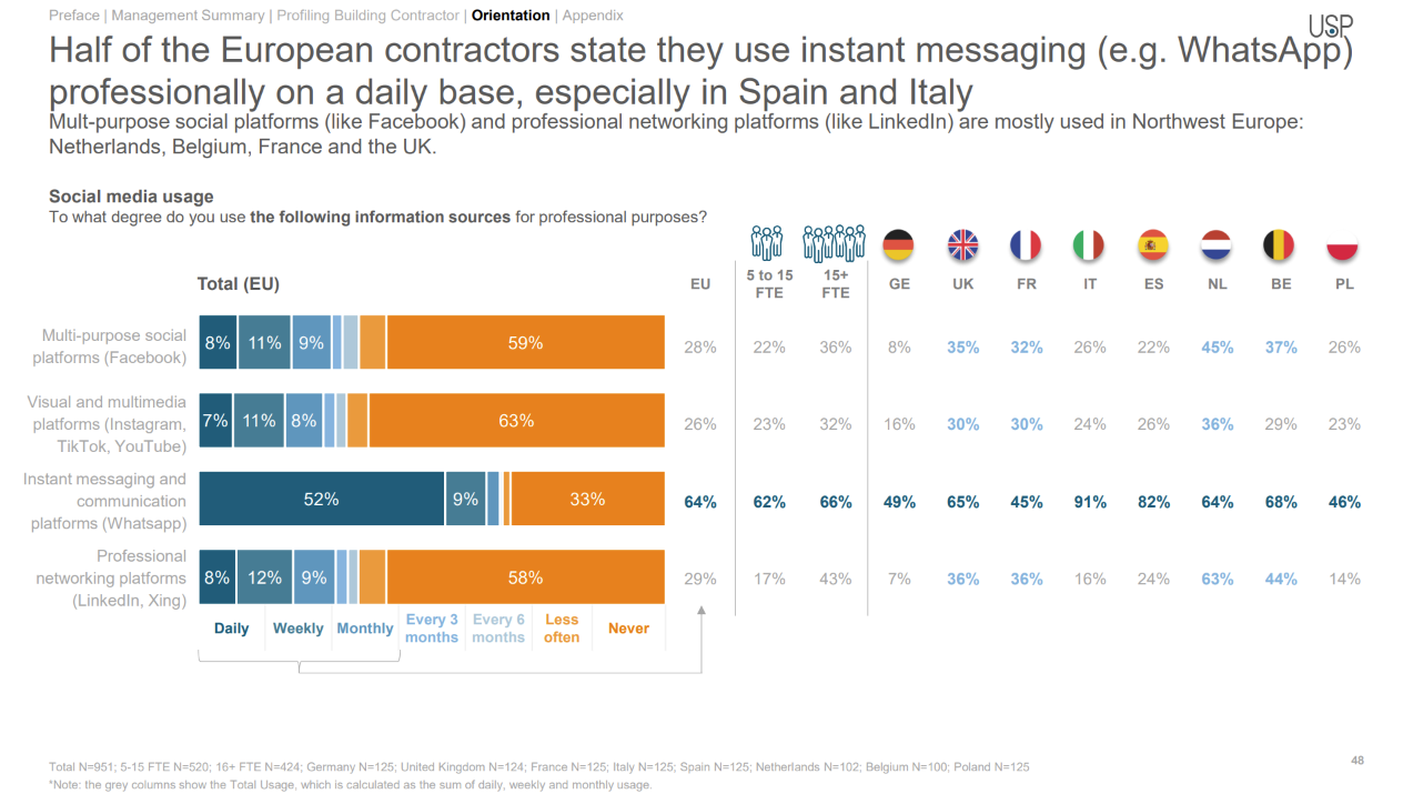 This report is based on 944 successful quantitative telephone interviews with general contractors, conducted in the native language in Spain, Italy, France, Belgium, the Netherlands, the UK, Germany and Poland. The report is based on a representative sample of contractors, with companies with less than 5 employees being excluded. This research is conducted biannually, with reports covering different key marketing topics like media orientation, BIM, prefab, sustainability, and many more.