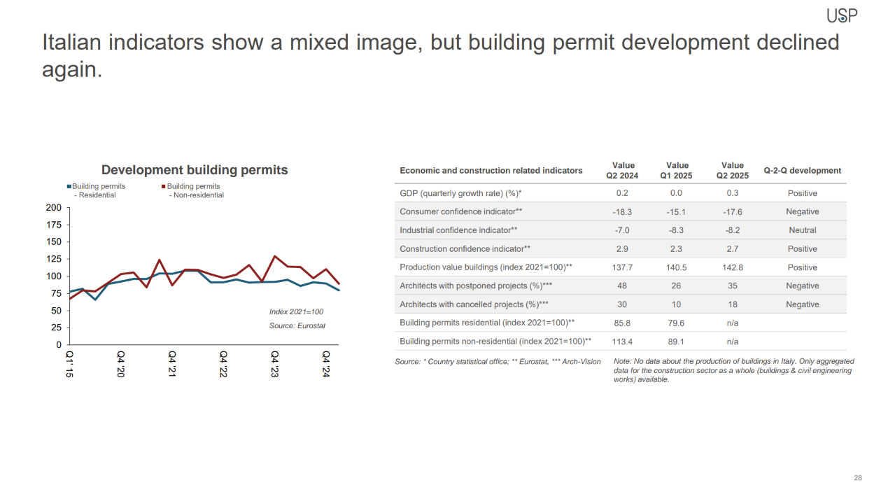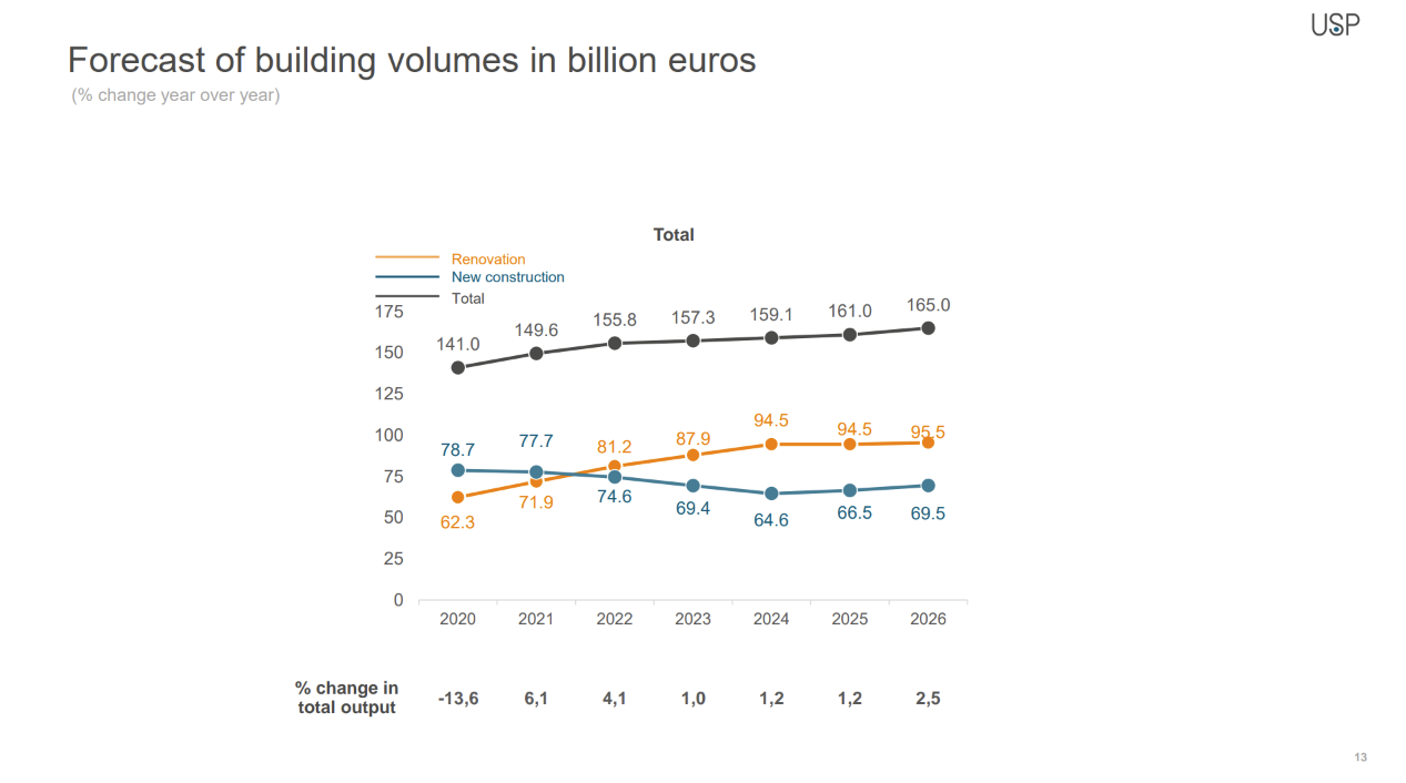 Architects play a pivotal role in the construction industry, serving as early indicators of both positive and negative changes. The trends and developments within architectural firms serve as valuable predictors for the overall construction market. USP publishes forecasts for building volumes based on insights gained from the experiences of architects (but also all other stakeholders that are regularly interviewed by USP in the construction business value chain) and 11 other market indicators. Our future building volumes predictions have proven accurate and have stood the test of time.