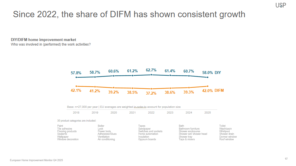 This report provides a comprehensive overview of the home improvement industry, specifically tailored to European consumers. Within this report, you will gain insights into how customers perceive improvements in their households, their primary motivations, and the significance of sustainability in their decisions. This report not only looks at Do It Yourself (DIY) versus Do It For Me (DIFM), but we also look closely at the planned and expected home improvement jobs that consumers will have in 2026. Additionally, the report delves into the economic landscape of the home improvement sector. This data can assist you in refining, enhancing, or developing your business, communication, and marketing strategies for the DIY consumer market in Europe. Our research is based on online interviews conducted with 26,400 European consumers hailing from Germany, the United Kingdom, France, the Netherlands, Belgium, Poland, Spain, Italy, Denmark, Sweden, and Austria.
