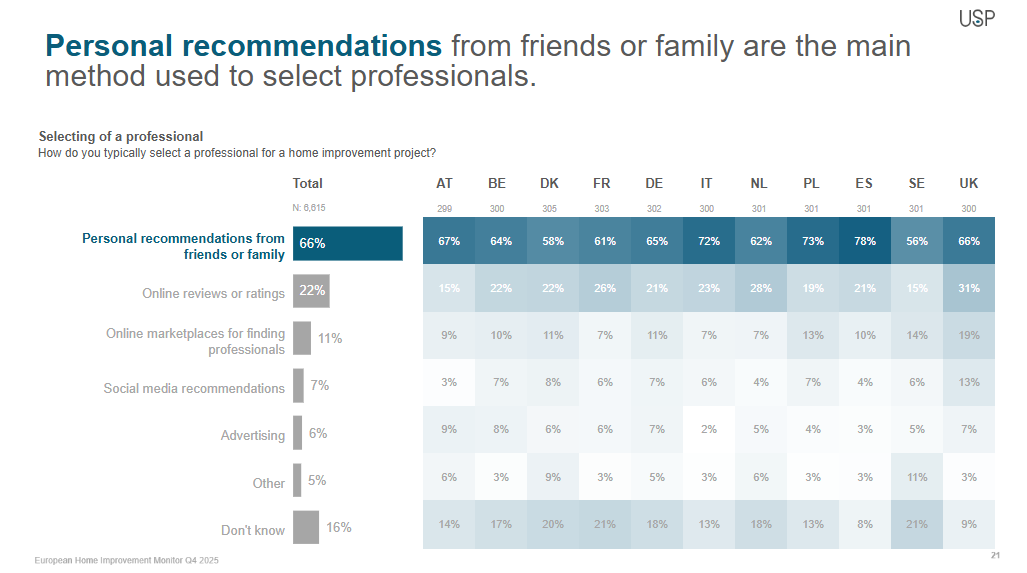 This report is based on 26,400 successful online interviews with consumers in European countries: Germany, the United Kingdom, France, Netherlands, Belgium, Poland, Spain, Italy, Denmark, Sweden and Austria. This research is conducted quarterly with the reports covering different key topics in the home improvement industry like consumer orientation, DIFM vs. DIY, sustainability, branding, digitalisation of the sector, purchase channels and many more.