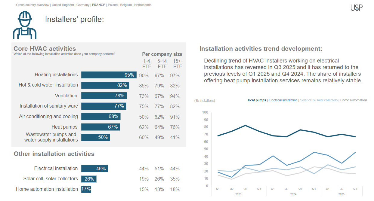 and the Netherlands. The report is based on a representative sample of installers, with companies that provide HVAC installation services, but they may also do other activities in addition (Electrical installation etc.). Most interviews are conducted with owners/ directors or purchasers of these companies. This research is conducted quarterly with reports covering different key marketing topics like media orientation, BIM, prefab, sustainability and many more.